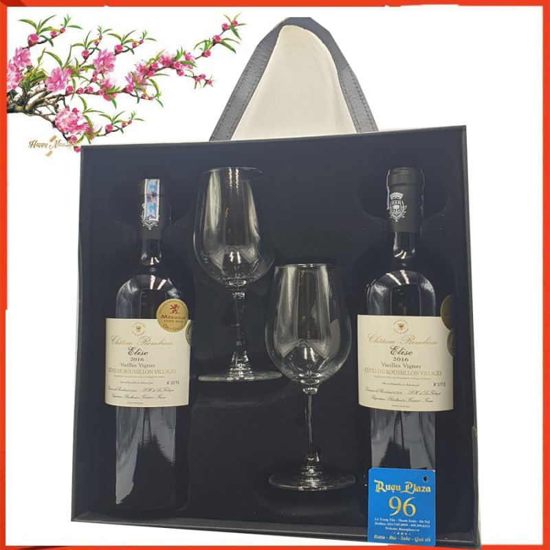 Hộp da 2 chai vang kèm ly vang Elise